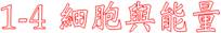 (四) 能量的獲得與轉換 A、 生物維持生命的能量,其最終來源大多為太陽能。 B、 C、 生物可藉呼吸作用將有機物分解,使蘊含其中的化學能釋出,而轉存於ATP中。 D、 ATP所蘊藏的能量又可轉換成光能、電能、化學能和機械能等能量形式,來維持細胞的生理功能。 E、