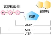 如果核糖上只接一個磷酸基時,稱為單磷酸腺苷(AMP)。 C、