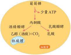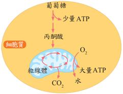(1) 葡萄糖→丙酮酸+少量ATP,此過程在細胞質中進行,不需氧參與 (2) 丙酮酸+O2→CO2+H2O+大量ATP,此過程在粒線體中進行,需氧參與 |