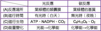 下列有關植物光合作用的光反應與碳反應的比較,何者正確? |