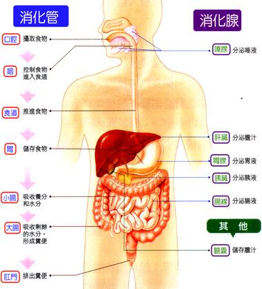 人體的消化系統: (1) 包括消化管和消化腺: 甲、 消化管:包括口、咽、食道、胃、小腸、大腸及肛門,具有容納、推送食物的功能。 乙、 消化管中有括約肌,可以防止食物的逆流,如胃與食道間的賁門括約肌、胃與十二指腸間的幽門括約肌等。 丙、 消化腺:包括唾腺、胃腺、腸腺、胰腺和肝臟,可分泌各種消化液,分解不同的食物。 D、