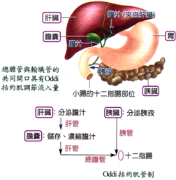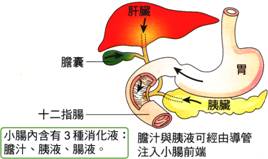 (4) 肝臟: 甲、 位於橫隔下方,腹腔右上方,呈紫紅色,為人體最大的消化腺。 乙、 可分泌鹼性的膽汁並儲存於膽囊,經由導管注入十二指腸。 丙、 膽汁成分: (a) 膽汁不含酵素,無法進行化學消化。 (b) 膽鹽:可乳化脂質,增加與酵素接觸的面積,加速脂質分解。 (5) 胰臟: 甲、 靠近胃與十二指腸之間,是一條狹長而扁平的腺體。 乙、 可分泌鹼性的胰液,藉由導管注入十二指腸。 丙、 胰液成分: (a) 胰澱粉酶:使澱粉及肝醣分解為麥芽糖。 (b) 胰蛋白酶:使蛋白質及大分子肽類分解為小分子肽類。 (c) 胰脂肪酶:使脂質分解為脂肪酸、甘油。 (6) 大腸: 甲、 包括盲腸、結腸和直腸三部分。 乙、 盲腸: (a) 肉食性、雜食性動物(人類)的盲腸通常較草食性動物短。 (b) 盲腸末端有一小段指狀突起,稱為闌尾,不具消化功能。 丙、 結腸: (a) 在腹腔中呈「ㄇ」字的形狀分布。 (b) 含有許多共生細菌,它們產生的維生素B、K,可被吸收後供人體利用。 丁、 直腸:位於結腸末端,和肛門相接。 (a) 主要功能是吸收水分、鹽類、維生素和儲存糞便。 (b) 腸內細菌代謝過程中會產生二氧化碳、硫化氫、氫以及甲烷等氣體。 (7) 肛門: 甲、 無法消化的食物殘渣,脫落的腸道細胞和大腸中的細菌一起形成糞便。 乙、 肛門本身具有括約肌,糞便由肛門排出,稱為排遺。 |