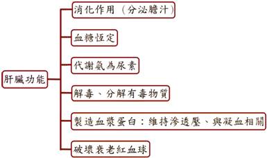 和血液功能相關: (1) 肝臟能合成大部分的血漿蛋白,有些與血液凝固有關,有些可維持體內滲透壓的恆定。 (2) 如果肝臟合成的血漿蛋白減少,會使血液滲透壓下降,水分積存在臉部及四肢的組織間隙與細胞中。 (3) 若與凝血有關的血漿蛋白減少,則皮膚容易出血或淤青。 (4) 肝臟能破壞衰老的紅血球:紅血球死亡破裂後,所釋出的血紅素,分解為水溶性的膽色素,隨膽汁經消化道,藉隨著糞便排出體外。 (5) 膽色素與瞻鹽共同形成膽汁,分泌後暫存於膽囊。 (6) 在胚胎時期,肝臟有造血功能。 C、