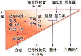 儲存物質:儲存肝醣、脂肪、蛋白質、維生素A、D、B12及鐵等物質。 H、