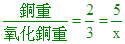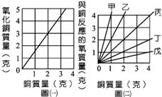 由物質的燃燒實驗中,發現氧的存在之科學家為__________,其並利用天平稱重,發現物質發生化學變化時,反應前後物質總重並未改變,而提出__________定律。 (2) 提出原子學說之科學家為__________,他另外認為兩種由相同元素所形成之不同化合物,固定其一質量,則另一質量必成簡單整數比,而提出__________定律。 (3) 發現於同溫、同壓下,氣體物質互相反應時,反應物間之體積將成一簡單整數比之科學家為__________,但此定律不能以原子學說解釋,故有另一科學家__________,提出決定物種化學性質之基本粒子應為__________,以修正原子學說。 【解答】:(1)己(拉瓦節);質量守恆 (2)丙(道耳頓);倍比 (3)戊(給鋁薩克);甲(亞佛加厥);分子 9. (1) 當5克的銅在空氣完全氧化時,生成氧化銅__________克。 (2) 圖(二)中甲∼戊五條直線中,何者可代表「銅」與「氧」相化合的質量關係?__________。 (3) 另取4克的銅與4克的氧,置於密閉容器內使其充分反應,可得氧化銅__________克,且剩餘__________(填銅或氧)__________克。 【解答】:(1)7.5 (2)丁 (3)6;氧;2 【解析】:(1) 由圖(一),2克的銅反應,可以產生3這的氧化銅; 10. 已知 【解答】:20 【解析】:已知 |