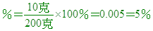 例題6.一杯200克的糖水中,溶解了10克的糖,則此溶液的重量百分率濃度為______%。 解答:5% 解析: |