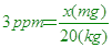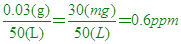 在50公升的污水試樣中,含有0.001莫耳的甲醇(CH3OH),已知甲醇的分子量為30,則此汙水試樣中,含甲醇的百萬分點濃度為若干? 解答:0.6ppm 解析: 0.001莫耳的甲醇(CH3OH)質量為0.001x30=0.03公克 例題22.工業酒精中含有微量的色素,若色素的百萬分點濃度為3ppm,則20公斤的工業酒精中含色素若干克? 解答:0.06公克 解析: