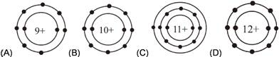 教學上有時會用電子點式來表示原子結構。下列選項中的阿拉伯數字代表質子數、「+」代表原子核所帶的正電荷、「●」代表核外電子,則哪一項代表離子? 【答案】:(D) 【解析】:(A)中心原子核有9個質子,外圍的電子=2+7=9個電子,成電中性。 ( )2.