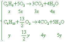假設C3H8有x莫耳,C4H10有y莫耳, |