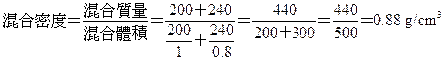 混合體積 = 水的體積 + 酒精體積=(200/1)+(240/0.8)
