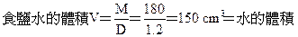 62. 密度1.25公克/毫升的食鹽水80毫升,需加入__________毫升的水,食鹽水密度始可變為1.1公克/毫升。 【答案】:120 【解析】:原食鹽水質量=V×D=80×1.25=