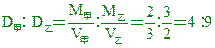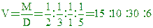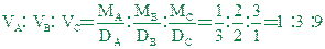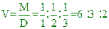 有ABC三物體,密度比為3:2:1,質量比為1:2:3,則三者的體積比為_______。 【答案】:1:3:9 【解析】:直接將比視為數值,即