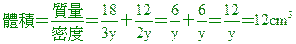 55. A液(密度2公克/立方公分)與B液(密度0.6公克/立方公分)均勻混合後,其密度為1.2公克/立方公分,試求: (1) A、B兩液體之體積比為________。 (2) 質量比為________。 【答案】:(1) 3:4; (2) 5:2 【解析】:假設甲的體積為x,乙的體積為y,則: