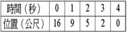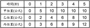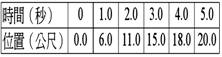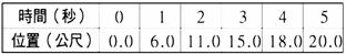 ( )10. 物體在一直線上朝同一方向運動,其位置與時間的關係如下表,此物體在0∼4秒內的平均速度為: