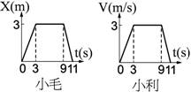 (A)0∼3秒小毛越走越快,位移為向東3m (B)3∼9秒小毛速度不變,位移為向東9m (C)3∼9秒小利速度不變,位移為向東18m (D)9∼11秒小利越走越慢,位移為向西3m。