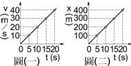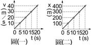 ( )148. 甲、乙兩車皆從原點同時出發,甲車的速度對時間的關係如圖(一)所示,乙車的位置對時間的關係如圖(二)所示,則兩車出發後,在距原點幾公尺處會再相遇?(A)20 (B)100 (C)200 (D)400公尺。